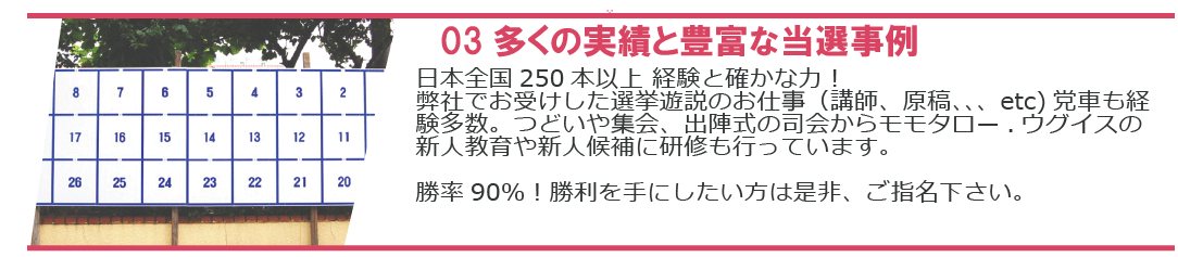 式典やパーティーの経験豊かなベテラン司会者からフレッシュな若手MCやDJまでまた選挙うぐいす嬢につきましては遊説の内容、スタッフのキャスティングやシフト組み地元の皆様へのウグイス嬢教育、イメージのコーディネイトなど、選挙活動の中の最後の総仕上げでもある”遊説活動”において、候補者様の魅力を最大限に引き出し担当者様が慣れない業務に憂うことなく、ご安心して勝利へのご活動に専念して頂けます様全力でお手伝いさせて頂きます。